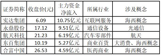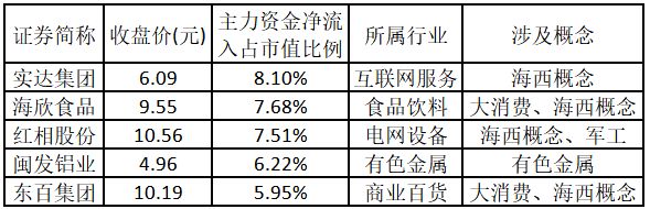 主力资金净流入金额占市值比例排名前5的个股分别为实达集团、海欣食品、红相股份、闽发铝业、东百集团。
