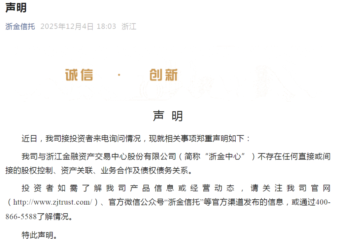 12月4日,浙金信托在其官方微信发布声明,具体如下:
