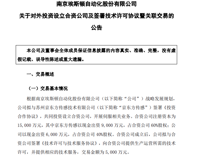 该合资公司注册资本为1.5亿元,其中京东方传感以现金出资9,000万元,占合资公司60%股权;埃斯顿以现金出资6,000万元,占合资公司40%股权。