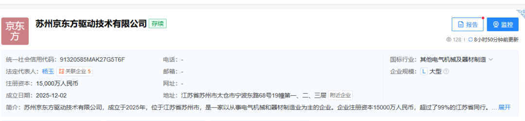 天眼查显示,近日,苏州京东方驱动技术有限公司成立,注册资本1.5亿元,经营范围包含电子元器件制造,电机制造,电动机制造等。