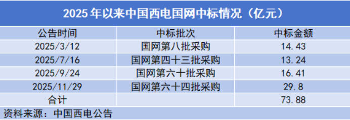 算上此次中标的29.8亿元,目前中国西电在2025年国网招标中累计斩获73.88亿元,几乎与2024年全年齐平。