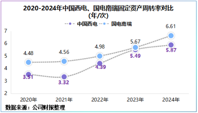 答案显而易见,中国西电意在缓解产能瓶颈。数据说话,公司固定资产周转率从2021年3.32年/次提高到了2024年的5.87年/次,近乎追平国电南瑞。