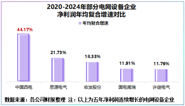 如果看净利润,中国西电几乎是业内的增速王。2020-2024年公司净利润年均复合增速高达44.17%,增速远超国电南瑞(11.91%)、许继电气(11.76%)等同行。