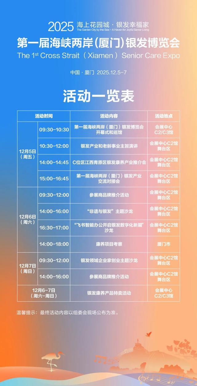 这场以“海上花园城·银发幸福家”为主题的行业盛会,由厦门建发国旅集团和厦门报业传媒集团联合主办。展会通过展示前沿适老成果、创新银发服务模式、深化两岸产业协作,为海峡两岸银发经济发展注入新动能。