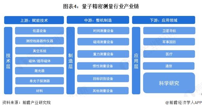 产业链上游为技术层,提供可为量子系统使用的激光、低温设备、测控线路器件仪器、磁体/超导磁体、真空系统、激光器、单光子探测器以及材料等。产业链中游主要是对上游产品进行一定的集成,以及开发与产品配套的软件或系统,提供整体解决方案,主要产品为时间测量设备、惯性测量设备、磁力测量设备、重力测量设备、目标识别设备等。产业链下游为应用方,即中游产品或技术的采购方,主要应用领域为卫星导航、军事国防、医疗、通信和科学研究机构等。