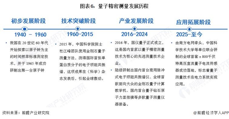 量子精密测量的发展始于20世纪初量子力学的建立,普朗克、爱因斯坦等科学家的理论探索奠定了基础,20世纪40年代原子钟的研制开启实用化进程,我国也于60年代成功研制首台原子钟。20世纪60年代至2015年为技术突破期,原子钟、核磁共振等设备成熟度持续提升,2015年杜江峰团队的单蛋白质分子电子顺磁共振谱成果引发全球关注。2016年国仪量子成立后,行业迈入产业发展阶段,多款国产量子测量仪器相继问世,但市场应用尚浅。2025年作为“国际量子科技年”,标志着行业进入应用拓展黄金时代,全球首套特高压直流量子电流传感器落地,量子设备在矿产勘探等领域实现突破。如今,时频、磁场测量进入成熟期,重力与惯性测量加速工程化,温度与压力测量崭露头角,在航天、半导体、能源等战略领域的价值持续释放,形成从理论到应用、从实验室到产业化的完整发展脉络。