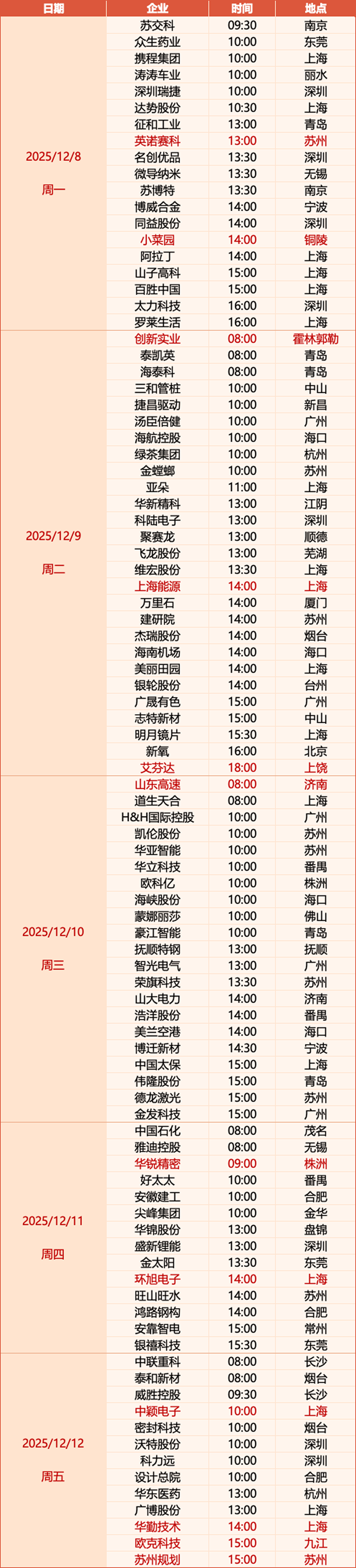 2025年12月8日至12日,资本市场将迎来密集的上市公司调研热潮,调研活动覆盖境内多座核心城市及境外部分区域,涉及多个高景气行业,为投资者洞察企业价值与行业趋势提供了重要契机。本次调研呈现出鲜明的地区聚集特征与清晰的行业热点导向,以下从地区分布、行业热点及整体趋势三方面展开分析。