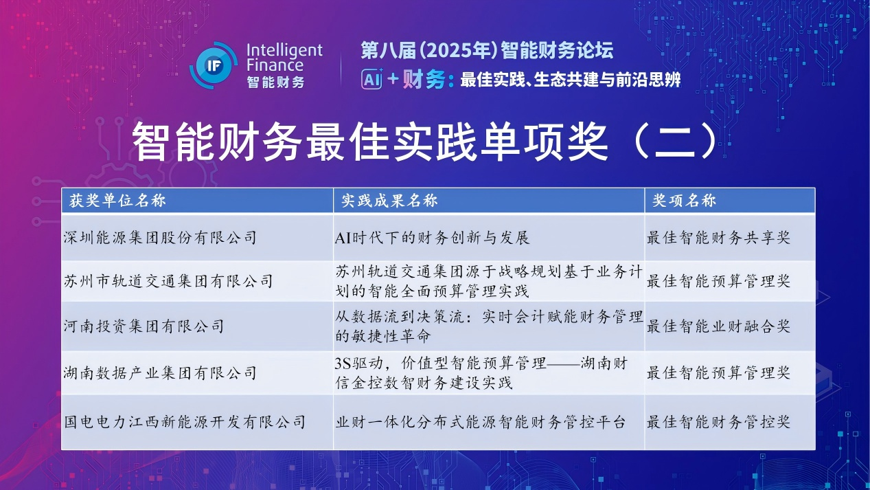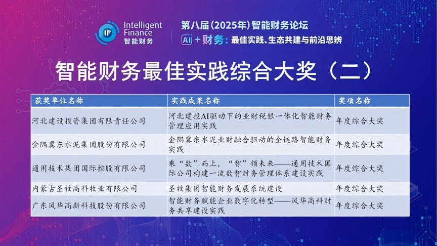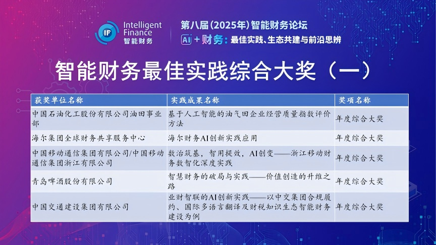 智能财务最佳实践年度综合大奖获奖单位和最佳实践名称分别为:中国石油化工股份有限公司油田事业部(基于人工智能的油气田企业经营质量指数评价方法)、海尔集团全球财务共享服务中心(海尔财务AI 创新实践应用)、中国移动通信集团有限公司/中国移动通信集团浙江有限公司(数治筑基,智用提效,AI创变——浙江移动财务数智化深度实践)、青岛啤酒股份有限公司(智慧财务的破局与实践——价值创造的升维之路)、中国交通建设集团有限公司(业财智联的AI创新实践——以中交集团合规履约、国际多语言翻译及财税知识生态智能财务建设为例)、河北建设投资集团有限责任公司(河北建投AI驱动下的业财税银一体化智能财务管理应用实践)、金隅冀东水泥集团股份有限公司(金隅冀东水泥业财融合驱动的全链路智能财务实践)、通用技术集团国际控股有限公司(乘 “数” 而上,“智” 领未来——通用技术国际公司构建一流数智财务管理体系建设实践)、内蒙古圣牧高科牧业有限公司(圣牧集团智能财务发展系统建设)、广东风华高新科技股份有限公司(智能财务赋能企业数字化转型——风华高科财务共享建设实践)。
