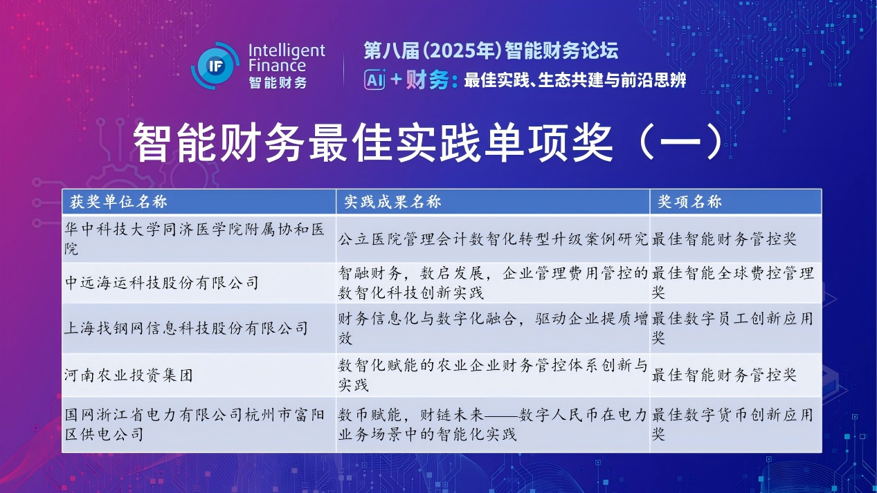 智能财务最佳实践单项奖获奖单位和最佳实践名称为:华中科技大学同济医学院附属协和医院(公立医院管理会计数智化转型升级案例研究)、中远海运科技股份有限公司(智融财务,数启发展,企业管理费用管控的数智化科技创新实践)、上海找钢网信息科技股份有限公司(财务信息化与数字化融合,驱动企业提质增效)、河南农业投资集团(数智化赋能的农业企业财务管控体系创新与实践)、国网浙江省电力有限公司杭州市富阳区供电公司(数币赋能,财链未来——数字人民币在电力业务场景中的智能化实践)、深圳能源集团股份有限公司(AI时代下的财务创新与发展)、苏州市轨道交通集团有限公司(苏州轨道交通集团源于战略规划基于业务计划的智能全面预算管理实践)、河南投资集团有限公司(从数据流到决策流:实时会计赋能财务管理的敏捷性革命)、湖南数据产业集团有限公司(3S驱动,价值型智能预算管理——湖南财信金控数智财务建设实践)、国电电力江西新能源开发有限公司(业财一体化分布式能源智能财务管控平台)。