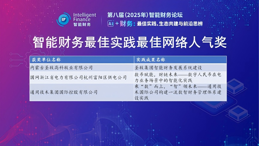 智能财务最佳实践最佳网络人气奖获奖单位和最佳实践名称为:内蒙古圣牧高科牧业有限公司(圣牧集团智能财务发展系统建设)、国网浙江省电力有限公司杭州富阳区供电公司(数币赋能,财链未来——数字人民币在电力业务场景中的智能化实践)、通用技术集团国际控股有限公司(乘“数” 而上,“智” 领未来——通用技术国际公司构建一流数智财务管理体系建设实践)。