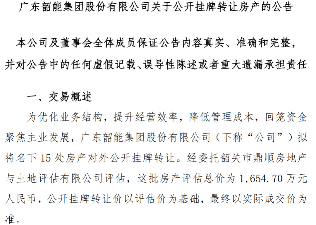 12月5日晚间,韶能股份(000601)发布公告称,为优化业务结构,提升经营效率,降低管理成本,回笼资金聚焦主业发展,公司拟将名下15处房产对外公开挂牌转让。经韶关市鼎顺房地产与土地评估有限公司评估,这批房产评估总价为1654.70万元,公开挂牌转让价以评估价为基础,最终以实际成交价为准。