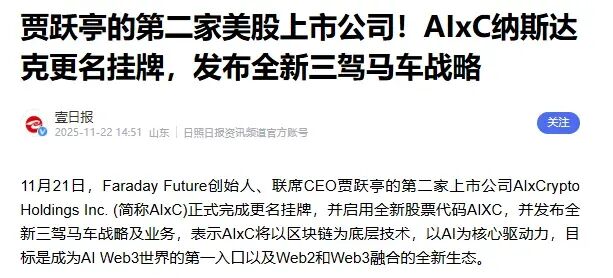 一家是大家熟知的FF,另一家则是2025年11月刚以“AIXC”为股票代码在纳斯达克挂牌的AIxCrypto Holdings Inc. 。