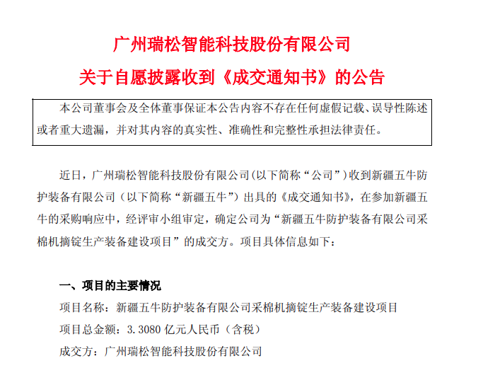 近日,广州瑞松智能科技股份有限公司(以下简称“瑞松智能”)成功中标“新疆五牛防护装备有限公司采棉机核心部件生产装备建设项目”,新项目总金额达3.308亿元人民币。
