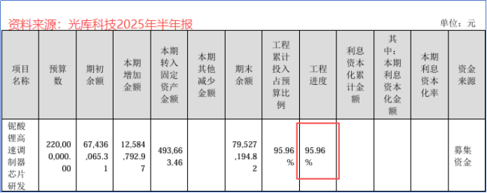 截至2025年上半年,公司铌酸锂高酸调制器芯片研发及产业化项目完工率达95.96%,即将释放产能。