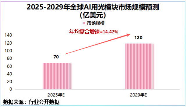 据行业预测,全球AI用光模块市场规模或将以14.42%的复合增长率,从2025年的70亿美元跃升至2029年的120亿美元。