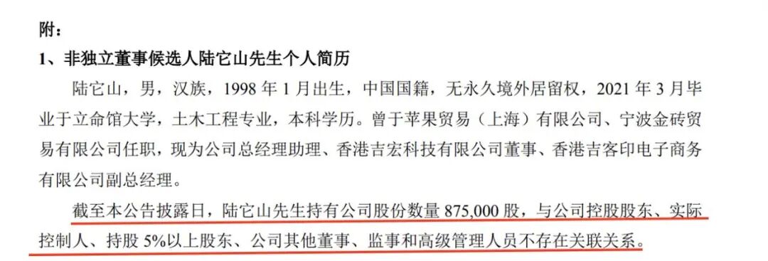 吉宏股份此次聘任的董事会秘书陆它山,年仅27岁,成为A股市场少有的“98后”董秘,其年轻化背景与深厚的股东背景引发市场广泛关注。陆它山2021年3月毕业于日本立命馆大学土木工程专业,毕业后先后任职苹果贸易(上海)有限公司供应链运营岗、宁波金砖贸易有限公司,2022年加入吉宏股份,历任董事长助理等职务。