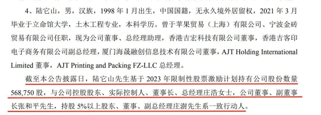 但据吉宏股份2024年1月17日披露的《关于增选第五届董事会非独立董事与独立董事的公告》显示,截至本公告披露日,陆它山持有公司股份数量87.5万股,与公司控股股东、实际控制人、持股5%以上股东、公司其他董事、监事和高级管理人员不存在关联关系。两个公告中一致行动人信息披露存在前后矛盾的情况。