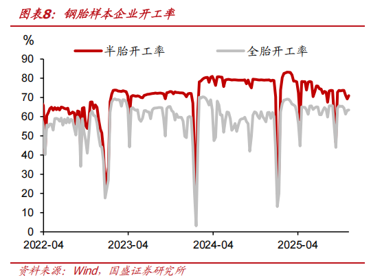 当周电炉开工率为59.6%,前值为60.9%;聚酯开工率为89.6%,前值为89.4%;半胎开工率为70.9%,前值为69.2%;全胎开工率为63.5%,前值为63.3%;PTA开工率为73.8%,前值为71.9%;PX开工率为89.7%,前值为90.1%;秦皇岛港煤炭调度为44.9万吨,前值为54.6万吨。