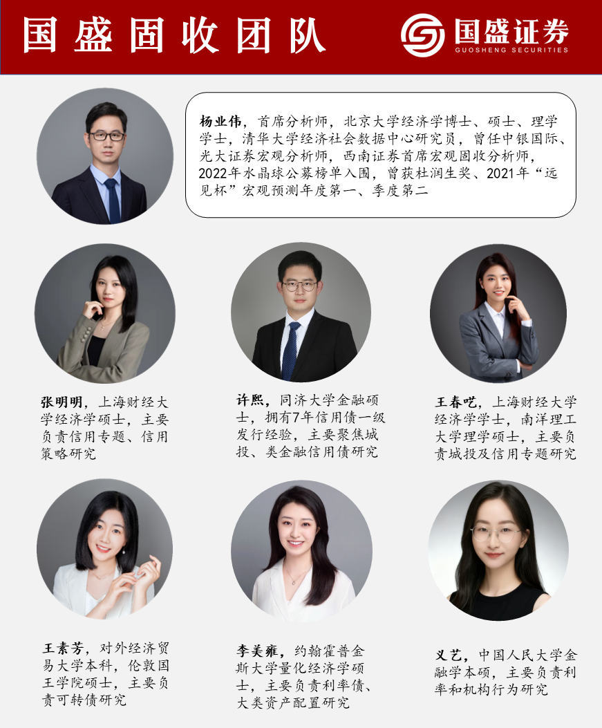重要声明:本订阅号是国盛证券固收组团队设立的。本订阅号不是国盛固收组团队研究报告的发布平台。本订阅号所载的信息仅面向专业投资机构,仅供在新媒体背景下研究观点的及时交流。本订阅号所载的信息均摘编自国盛证券研究所已经发布的研究报告或者系对已发布报告的后续解读,若因对报告的摘编而产生歧义,应以报告发布当日的完整内容为准。本资料仅代表报告发布当日的判断,相关的分析意见及推测可在不发出通知的情形下做出更改,读者参考时还须及时跟踪后续最新的研究进展。本资料不构成对具体证券在具体价位、具体时点、具体市场表现的判断或投资建议,不能够等同于指导具体投资的操作性意见,普通的个人投资者若使用本资料,有可能会因缺乏解读服务而对报告中的关键假设、评级、目标价等内容产生理解上的歧义,进而造成投资损失。因此个人投资者还须寻求专业投资顾问的指导。本资料仅供参考之用,接收人不应单纯依靠本资料的信息而取代自身的独立判断,应自主作出投资决策并自行承担投资风险。版权所有,未经许可禁止转载或传播。