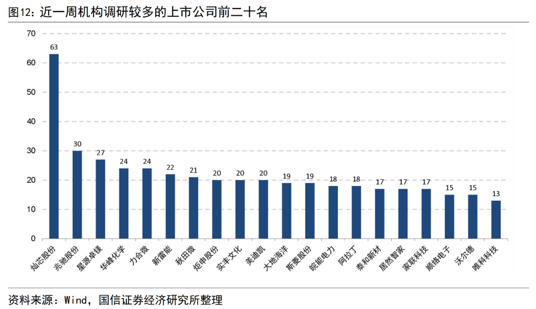 上市公司会披露投资者或分析师对其的调研活动。这里我们统计近7天内对上市公司调研或举行分析师会议的机构数量。下图展示了近一周内被机构调研较多的前二十名上市公司,不足二十名时直接取现有数量。可以看到,近一周内调研机构较多的股票是灿芯股份、兆驰股份、星源卓镁、华峰化学、力合微、新雷能、秋田微、炬申股份等,灿芯股份被63家机构调研。