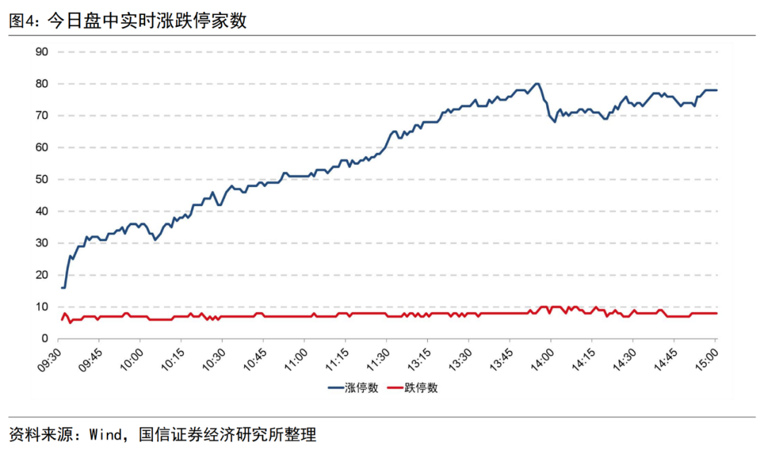 我们统计上市满3个月以上的股票在今日盘中的实时涨跌停家数情况。今日盘中最高有80只股票涨停,收盘时有78只股票涨停,盘中最高有10只股票跌停,收盘时有8只股票跌停,今日日内实时涨跌停家数如下图所示。