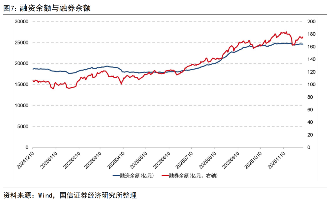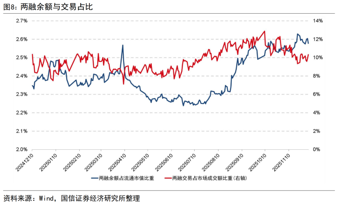 我们计算两融余额占市场总流通市值的比重与两融交易(融资买入额+融券卖出额)占市场总成交额的比例来反映两融交易的活跃情况。近一年来两融余额占流通市值的比重维持在2.4%左右,两融交易占市场成交额的比重维持在9.8%左右,截至 20251205 两融余额占流通市值比重为2.6%,两融交易占市场成交额比重为10.3%,近一年两融余额与交易占比如下图所示。