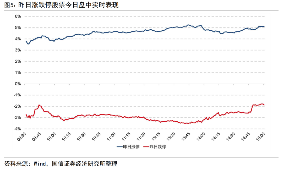 我们统计上市满3个月以上且昨日收盘涨停或跌停的股票在今日盘中的实时表现。昨日涨停股票今日高开高走,收盘收益为5.10%,昨日跌停股票今日收盘收益为-1.87%。昨日涨跌停股票今日盘中实时表现如下图所示。