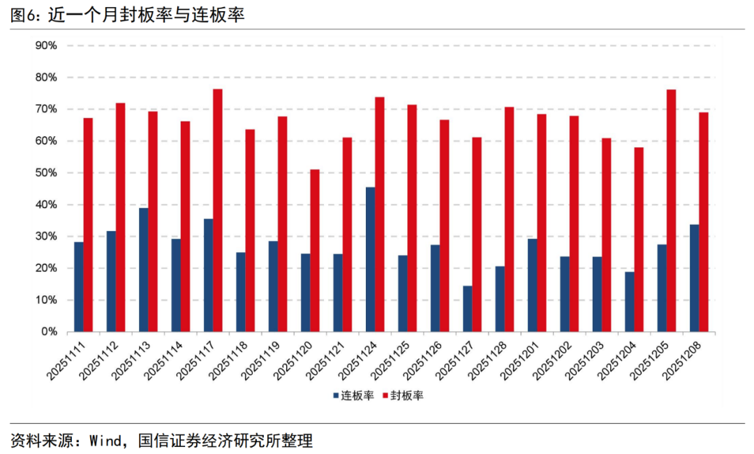 今日封板率69%,较前日下降7%,连板率34%,较前日提升6%,近一个月封板率与连板率如下图所示。