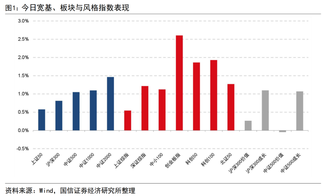 板块指数中,创业板指表现较好,上证综指上涨0.54%,深证综指上涨1.22%,中小100指数上涨1.12%,创业板指上涨2.60%,科创50指数上涨1.86%,科创100指数上涨1.93%,北证50指数上涨1.27%。