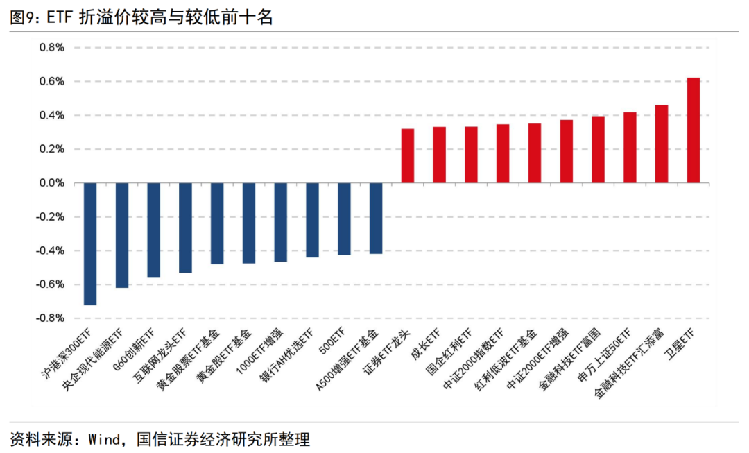 ETF是一种在交易所上市交易的、基金份额可变的开放式基金,其可在场外进行申购赎回,也可以在场内交易。其在场内交易的价格与场外价格的差距在一定程度上反映了投资者的情绪。这里我们统计日成交额超过100万的境内交易股票型ETF的折溢价情况。20251205当日溢价较多的是卫星ETF,溢价0.62%,折价较多的是沪港深300ETF,折价0.72%,折溢价较高与较低的前十名ETF如下图所示。