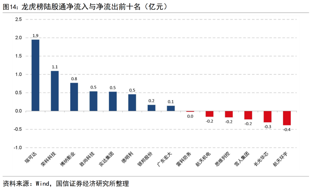 20251208披露龙虎榜数据中,陆股通净流入前十的股票是瑞可达、荣科科技、博纳影业、致尚科技、实达集团、德明利、银邦股份、广东宏大等,陆股通净流出前十的股票是航天环宇、长光华芯、雪人集团、思维列控、航天机电、雷科防务等,下图展示了今日龙虎榜披露的陆股通买卖股票中净流入与净流出的前十名,不足十名时直接取现有数量。
