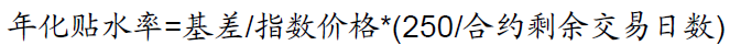 股指期货是指以股价指数为标的物的标准化期货合约,双方约定在未来的某个特定日期,可以按照事先确定的股价指数的大小进行标的指数的买卖。股指期货与现货指数价格的差被称为基差,当股指期货价格高于现货指数价格时,股指期货处于升水,基差为正;反之,股指期货处于贴水,基差为负。股指期货升贴水主要受金融市场利率、股市分红、微观资金成本、套利力量、市场情绪等影响,基差大小会影响股指对冲的成本,基差的变化一定程度上能反映市场对于未来预期的表现。国内目前有上证50、沪深300与中证500指数股指期货。我们计算每日股指期货主力合约的年化贴水率。年化贴水率的计算方式为: