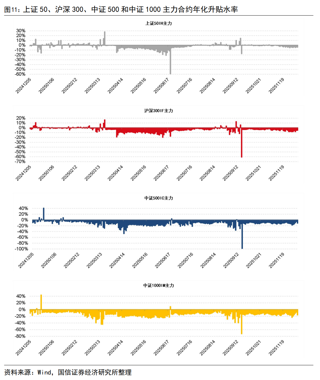近一年以来上证50、沪深300、中证500、中证1000股指期货主力合约的年化贴水率中位数分别为0.68%、3.57%、11.15%、13.61%,20251208当日上证50股指期货主力合约年化贴水率为4.01%,处于近一年来31%分位点,当日沪深300股指期货主力合约年化贴水率为5.14%,处于近一年来35%分位点;当日中证500股指期货主力合约年化贴水率为10.99%,处于近一年来52%分位点;当日中证1000股指期货主力合约年化贴水率为15.96%,处于近一年来36%分位点。近一年上证50、沪深300、中证500和中证1000主力合约年化升贴水率如下图所示。