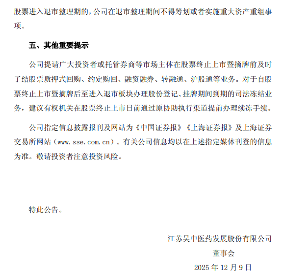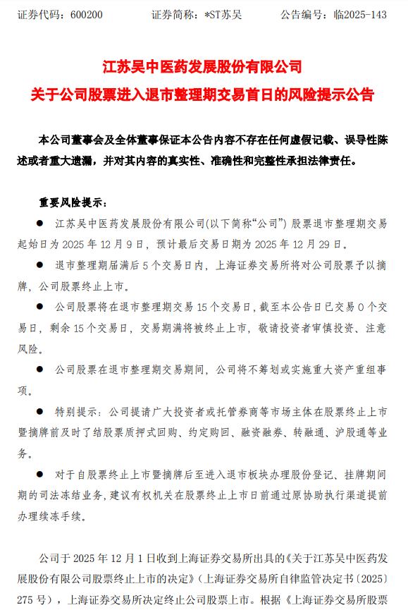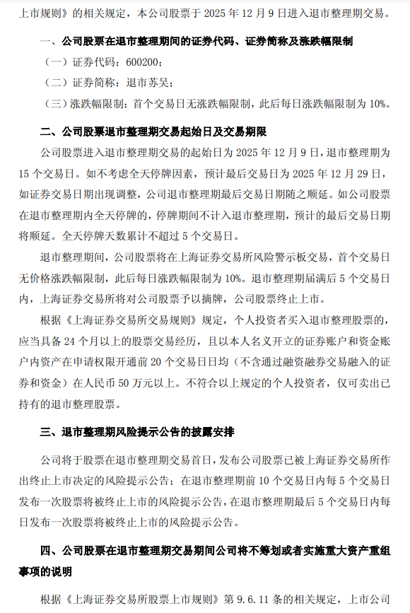 【退市整理】*ST苏吴:关于公司股票进入退市整理期交易首日的风险提示公告