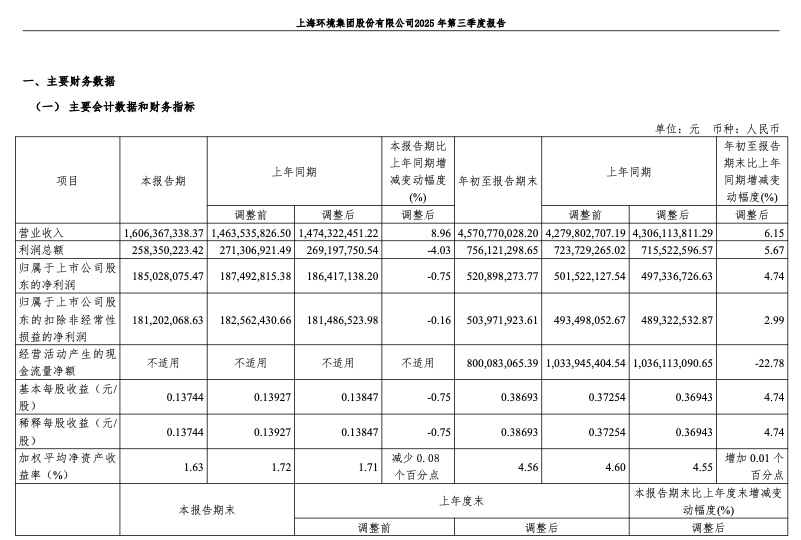 上海环境(601200)发布2025年三季度报,今年前三季度,公司实现营收45.71亿元,同比增长6.15%;归属于上市公司股东的净利润5.21亿元,同比增长4.74%。其中,第三季度营收为16.067亿元,同比增长8.96%;归属于上市公司股东的净利润1.85亿元,同比下降0.75%。