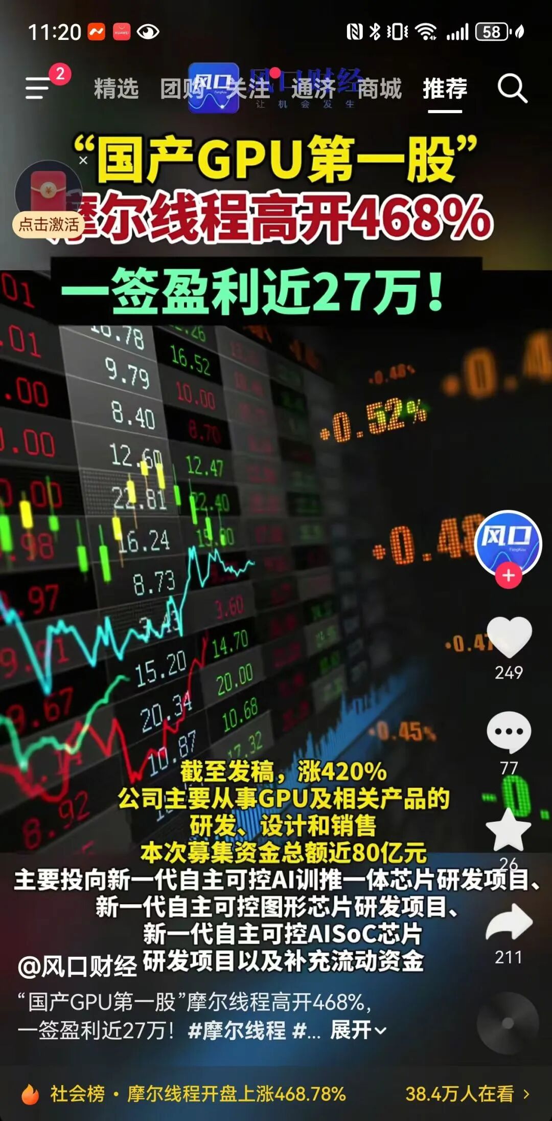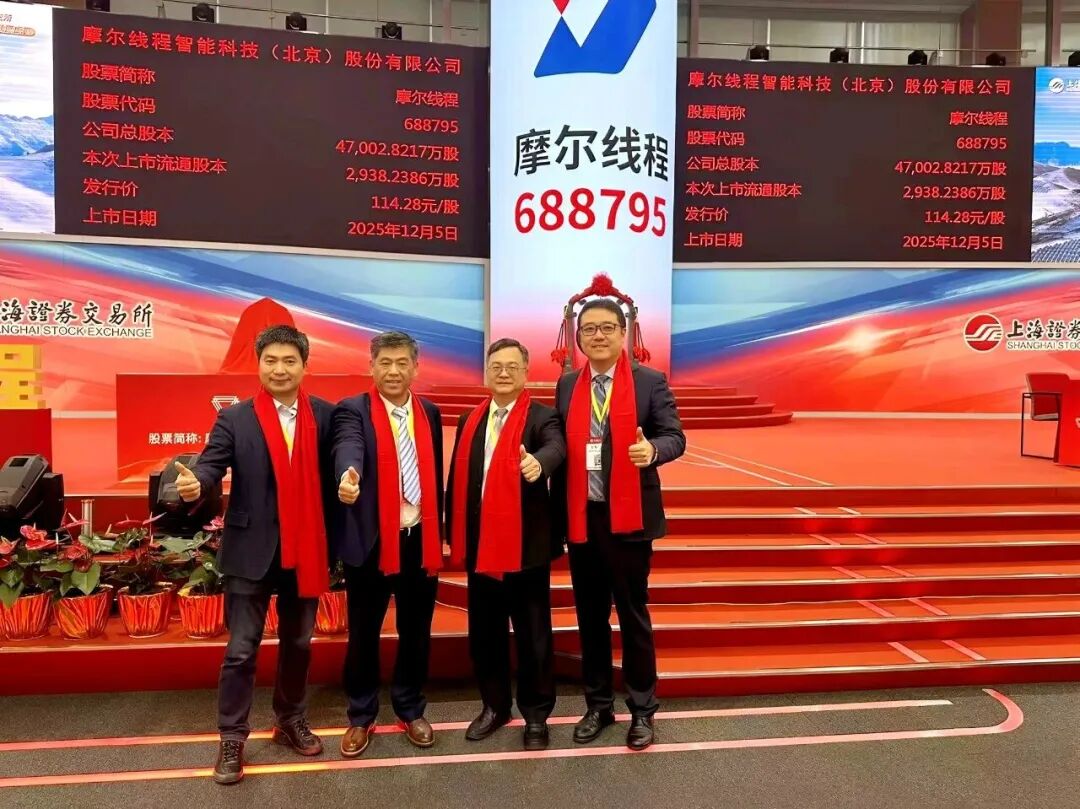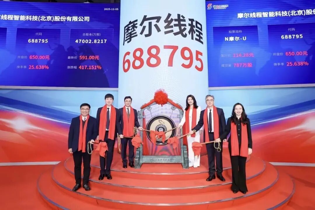 2025年12月5日,摩尔线程成功登陆科创板,在国产GPU“四小龙”的赛道上,摩尔线程率先冲线成功,登陆资本市场。上市首日,公司股价大涨425.46%,收盘价报每股600.5元,总市值达2823亿元。