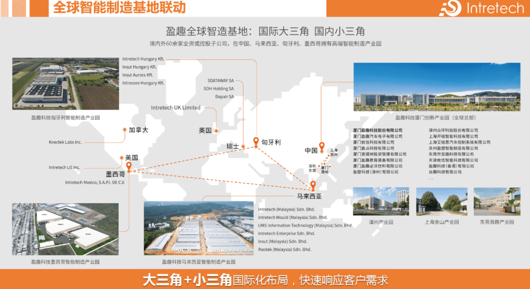 为确保这条生命线的全球韧性,盈趣科技构建了横跨三大洲的“大三角+小三角”国际化布局。在中国、马来西亚、匈牙利、墨西哥设立智能制造基地,并在瑞士、英国、美国等地设立研发与市场中心,形成了跨时区、跨地域的全球化研发与运营网络。