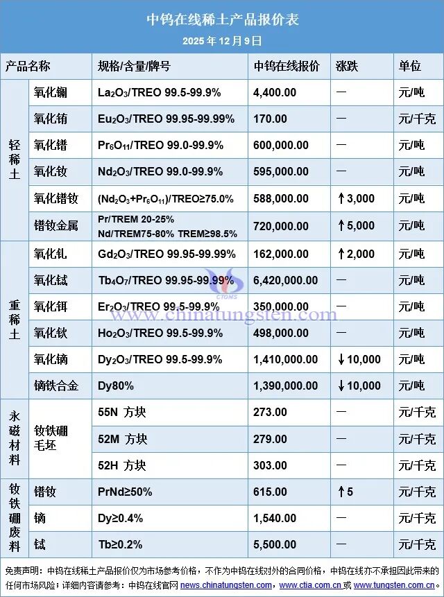 国内稀土市场整体呈现涨跌互现的格局,其中氧化镨钕与镨钕金属价格约涨3,000元/吨和5,000元/吨,而氧化镝价格则约降10,000元/吨。