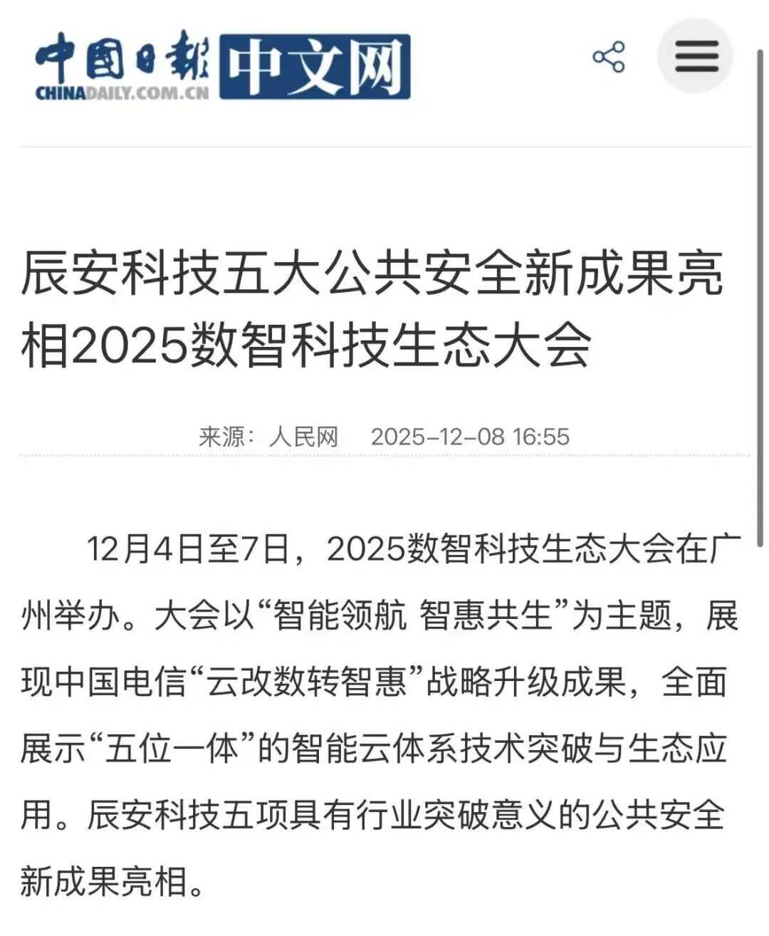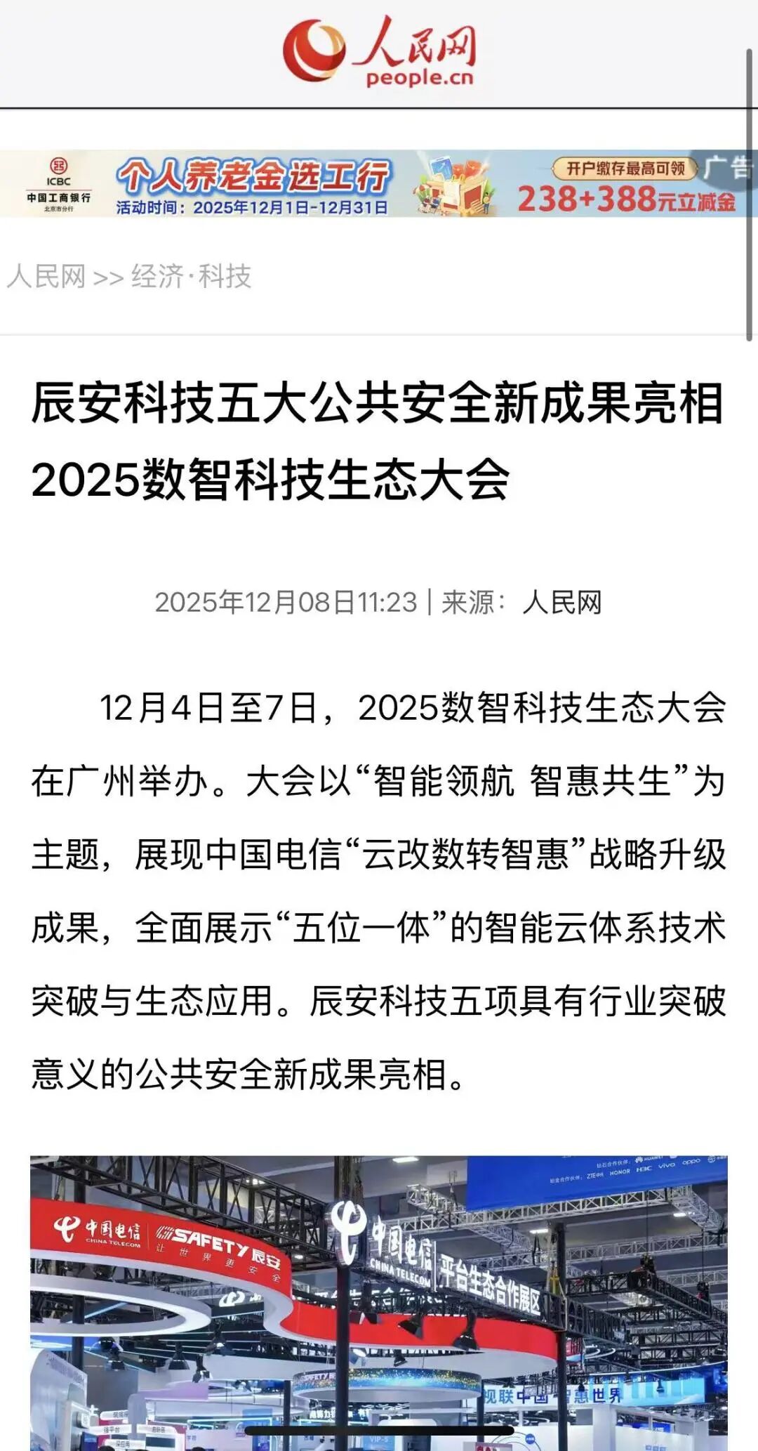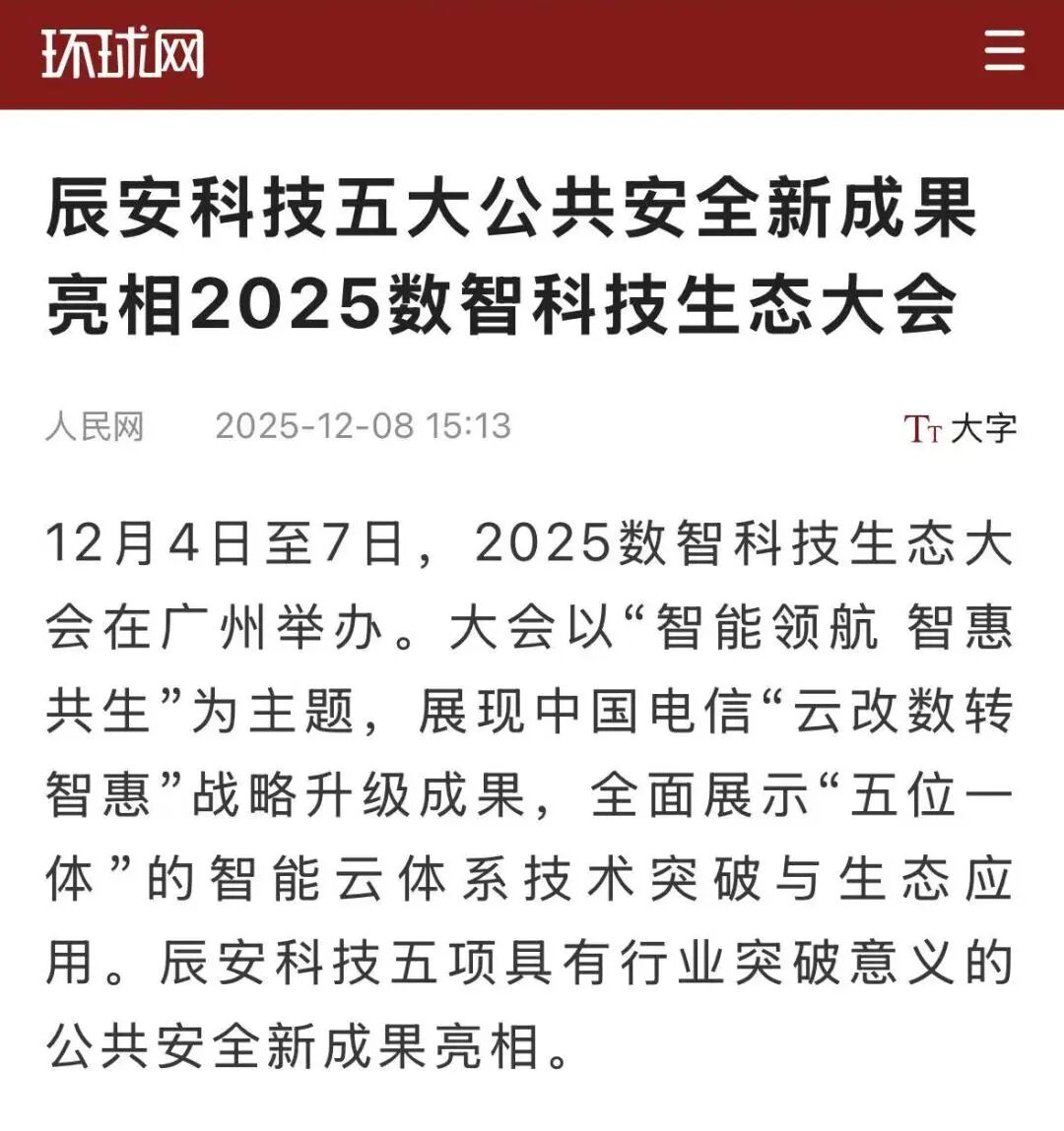 12月4日至7日,2025数智科技生态大会在广州举办。大会以“智能领航 智惠共生”为主题,展现中国电信“云改数转智惠”战略升级成果,全面展示“五位一体”的智能云体系技术突破与生态应用。辰安科技五项具有行业突破意义的公共安全新成果亮相。