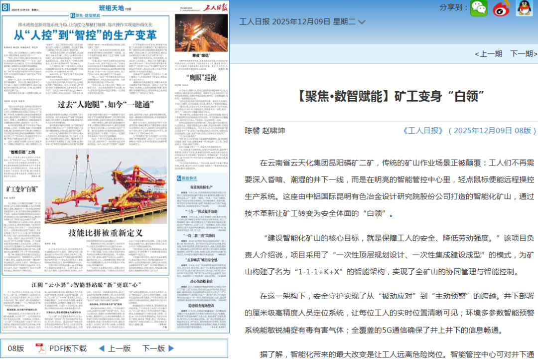 从深邃巷道到明亮中控室,从“黑领”到“白领”,矿工身份的转变背后,是科技赋能传统产业的深刻变革。12月9日,《工人日报》刊发《矿工变身“白领”》,报道了中铝国际昆明有色院云天化昆阳磷矿二矿智能化项目以“一次性顶层设计、集成建设”模式,构建起全矿协同智能管控体系,让矿工远离高风险环境,在安全体面的岗位上实现“鼠标采矿”。这不仅是对生产方式的革新,更是对“以人为本”安全理念的生动践行。一起来看原文报道。