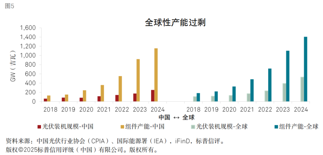 2025年光伏行业整体产能过剩,是需求增速不及供给扩张与供给端产能退出机制滞后的共同结果。当前,光伏制造业供给呈现出显著的结构性过剩特征:由于行业进入门槛较低,产能快速扩张,尤其中国企业主导推动全产业链产能持续高速增长。截至2024年底,中国光伏组件年产能已突破1100GW,远超全球约530GW的实际装机需求,供需失衡问题日益凸显。