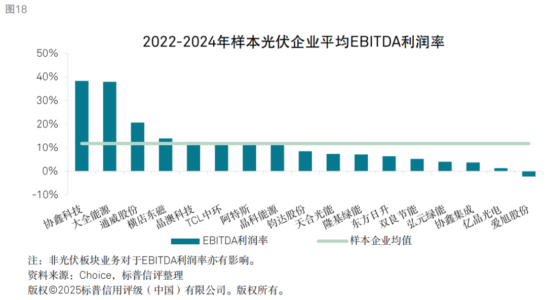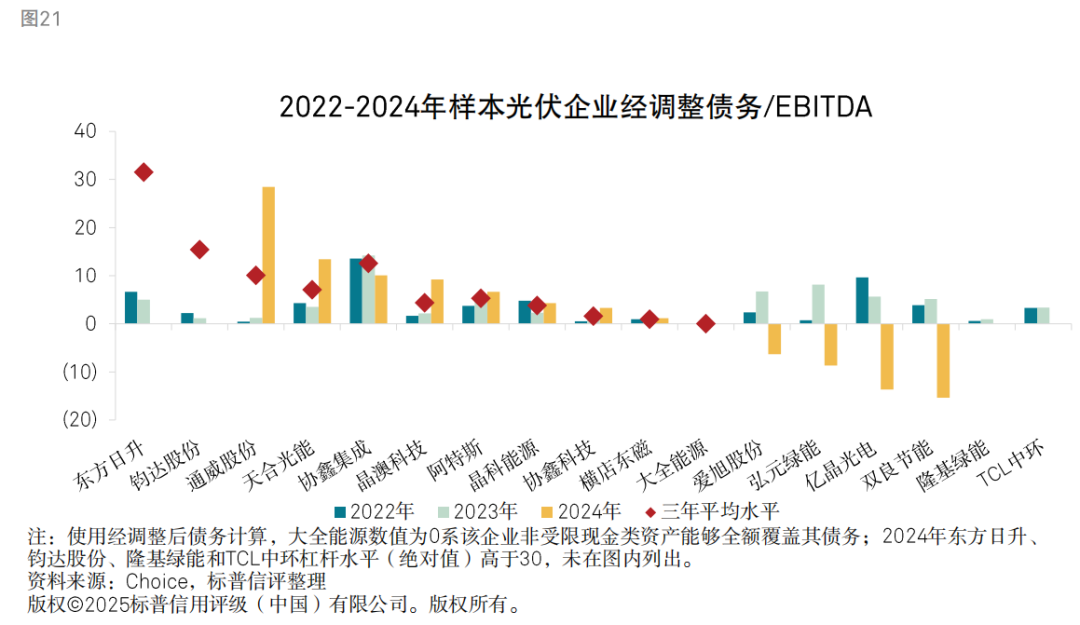 财务风险偏高企业则具有以下特征:经调整债务/EBITDA比率承压甚至为负,资本开支/EBITDA高企,经营性现金流存在较大波动。典型企业如亿晶光电、爱旭股份、东方日升、协鑫集成。