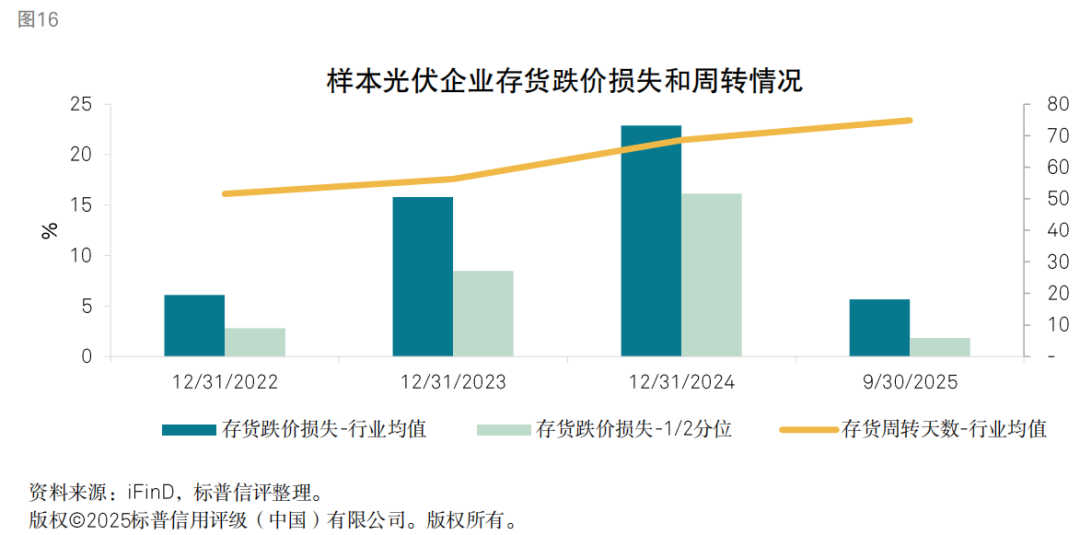 光伏产业链各环节对存货减值的敏感度存在差异:硅料企业虽受价格暴跌影响,但产品标准化程度高、流动性相对较好;硅片与电池厂商则面临双重打击:一方面技术快速向N型切换,导致P型产线库存迅速贬值;另一方面产能过剩导致产品价格持续低于现金成本,被迫计提大额跌价准备;组件企业虽可通过定制化订单缓冲部分库存压力,但在终端需求阶段性放缓(如欧洲去库存)时,仍难避免组件价格跳水带来的减值冲击。