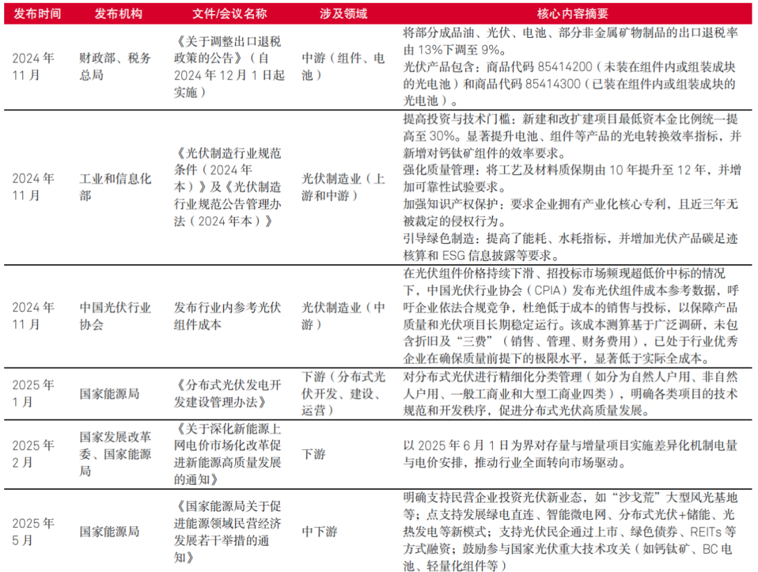 二是需求端不确定性加剧:全球经济增长放缓抑制投资意愿;部分国家加速推行本土制造保护政策,压缩中国出口空间。(近期光伏行业相关政策详见附表2)