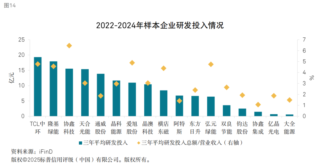 快速的技术更替叠加大规模产能扩张,不仅推高了固定资产减值压力,也加剧了行业供需失衡与“内卷式”竞争。当前,龙头企业凭借高绝对额的研发投入构筑技术壁垒,相比之下,缺乏核心技术护城河的企业研发投入薄弱,在产能过剩与技术迭代的双重挤压下,产能加速出清。样本企业中,TCL中环、隆基绿能、协鑫科技、天合光能和通威股份保持了较高的研发投入,而协鑫科技、TCL中环、隆基绿能的研发投入总额/营业收入保持较高水平。