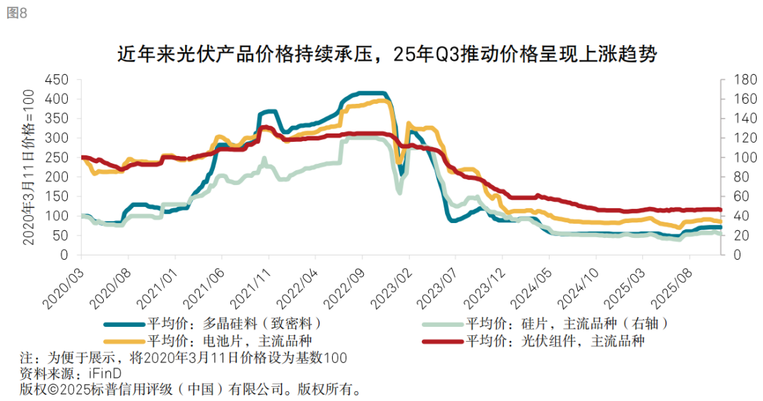 中国政府出台新规遏制无序扩产,并推动行业从“规模驱动”向“技术竞争”结构化转型。这些措施使得光伏产品价格逐步企稳。然而,结构性产能过剩压力依然显著:当前光伏产品价格普遍不及2020年,约为当年价格的30%–70%,其中电池、组件等环节价格下降较多,行业整体仍处于“内卷式”恶性竞争状态。