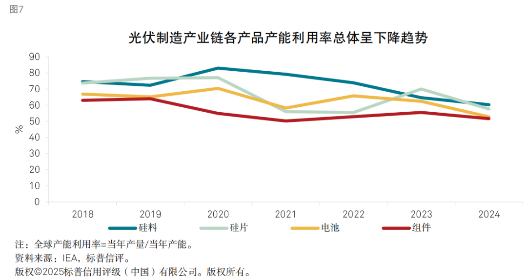 供给扩张持续加剧,导致光伏产业链各环节产能利用率普遍回落,行业面临日益严峻的结构性产能过剩风险。2023–2024年,随着上游多晶硅新产能集中释放,全产业链进入新一轮扩产高峰,但全球新增装机增速不及产能扩张速度,供需失衡加剧。IEA数据显示,2024年全球各环节产能利用率全面承压:多晶硅降至60%,硅片58%,电池片53%,组件仅52%,为近五年较低水平。尤其值得注意的是,越往产业链下游(如光伏组件),参与者越多、进入门槛越低,产能冗余问题越严重,利用率长期徘徊在50%–60%区间。