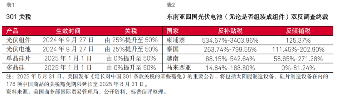 自2011年起,美国对中国的晶硅光伏电池及组件实施“双反”并征收保证金。2024年,美国在301关税框架下将光伏电池税率从25%提升至50%,并调整201关税,取消双面组件豁免,同时将电池免税配额由5GW提高至12.5GW。然而,这些政策对中国企业的直接贸易影响较弱,因为多年受限于贸易壁垒,中国光伏企业早已将美国市场的供应渠道转移至东南亚产能,对美直接出口规模较小。中国光伏制造产品出口主要以组件为主,2024年中国光伏组件产量588GW,出口量239GW,占比达到41%,其中中国本土生产的组件对美直接出口占比已不足1%。