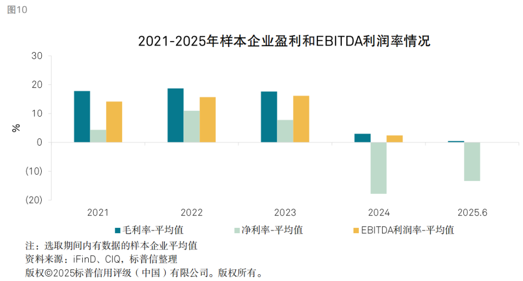 这一局面迅速体现在财务表现上:2024年光伏企业普遍陷入严重亏损,财报净利大面积为负。企业被迫以规模换生存,在激烈竞争中持续压价,进一步加剧价格下行压力,形成恶性循环。根据我们测算,2024年以来样本企业盈利能力急剧恶化:平均毛利率大幅收窄,平均净利率转为负值;尤为严峻的是,EBITDA(息税折旧摊销前利润)亦大幅下滑,表明即便剔除折旧与摊销等非现金支出,企业的核心经营性现金流仅勉强覆盖运营成本,部分EBITDA为负,经营质量出现实质性退化。