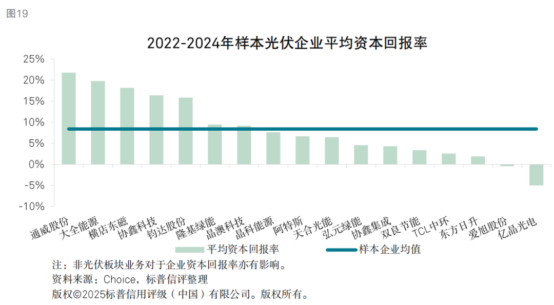 光伏制造属于典型的重资产行业,具有高资本开支、高折旧摊销的特征。在此背景下,EBITDA利润率通过剔除折旧与摊销等非现金支出,能够更真实地反映企业核心业务的经营性现金流生成能力与运营效率。而资本回报率(ROC)作为衡量重资产行业投入产出效率的核心指标,对评估企业的真实盈利能力具有重要参考价值。样本企业在产业链环节布局、一体化程度及技术路线选择等方面存在显著差异,其盈利能力和EBITDA表现亦呈现明显分化。
